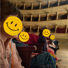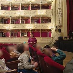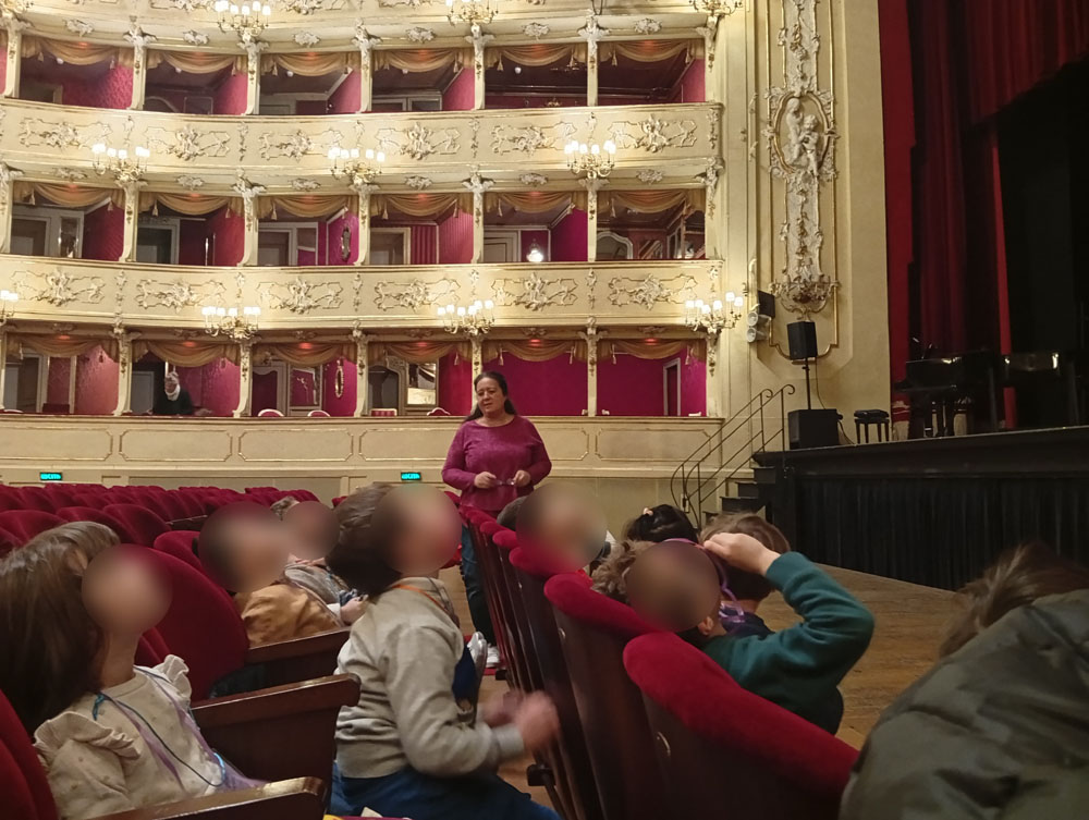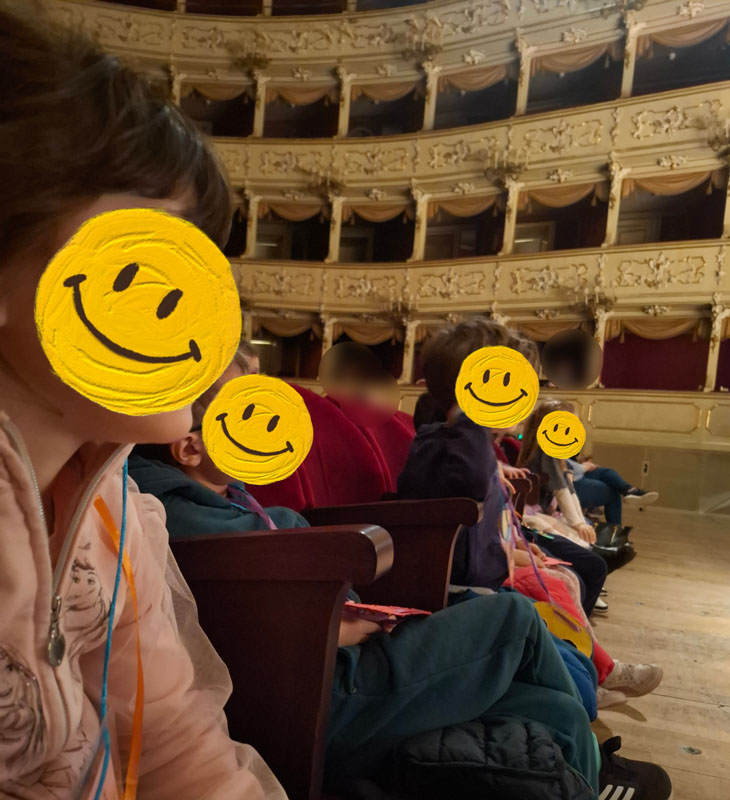 La giornata è iniziata con grande entusiasmo: il viaggio in pullman, l’ingresso nel prestigioso teatro e la scoperta della sua splendida sala hanno subito catturato l’attenzione dei bambini, che hanno osservato con curiosità ogni dettaglio dell’ambiente.